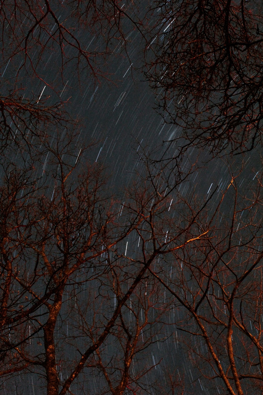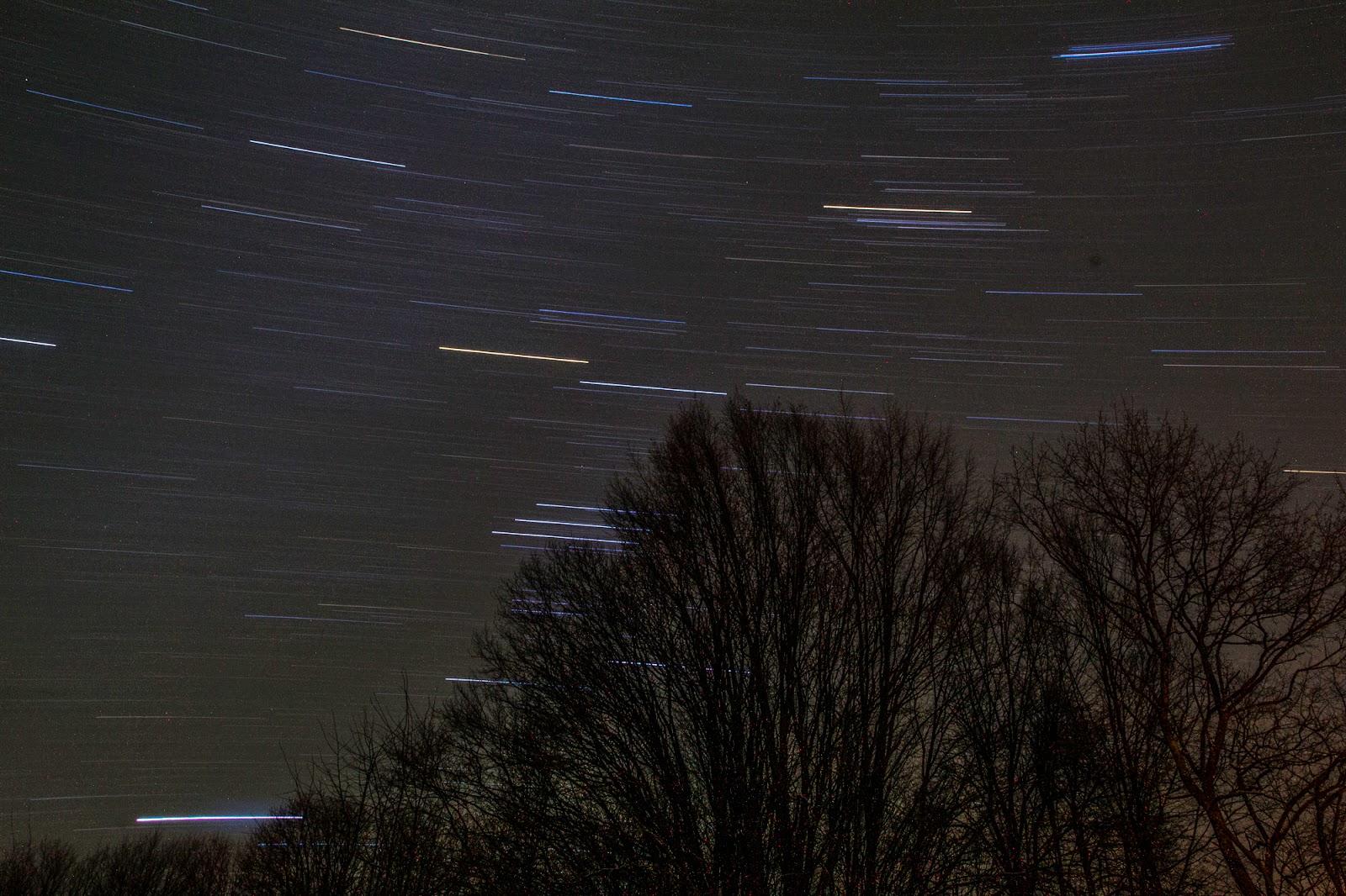 Mróz sprzyja rozgwieżdzeniu nocy! Przy braku miejskich świateł, w całkowitych ciemnościach gwiazd nie dało się zliczyć, coś pięknego. Z niemałym poświęceniem (-15*C!) oddaliśmy się przyjemności fotografowania. Z nowo otrzymanym sprzętem (wężyk spustowy) testowałam długie naświetlanie nieba i uchwyciłam zamierzony sobie efekt – obrót Ziemi względem gwiazd, widoczny w odwrocie jako ruch gwiazd względem Ziemi.