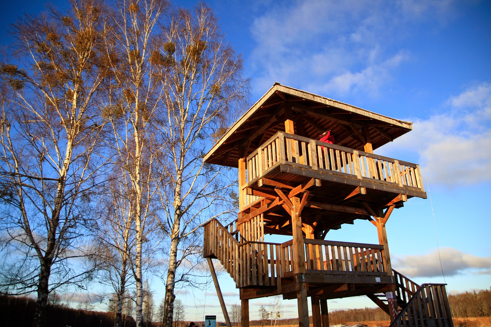Punkt obserwacyjny na mokradłach, podmarzniętych pierwszymi mrozami.