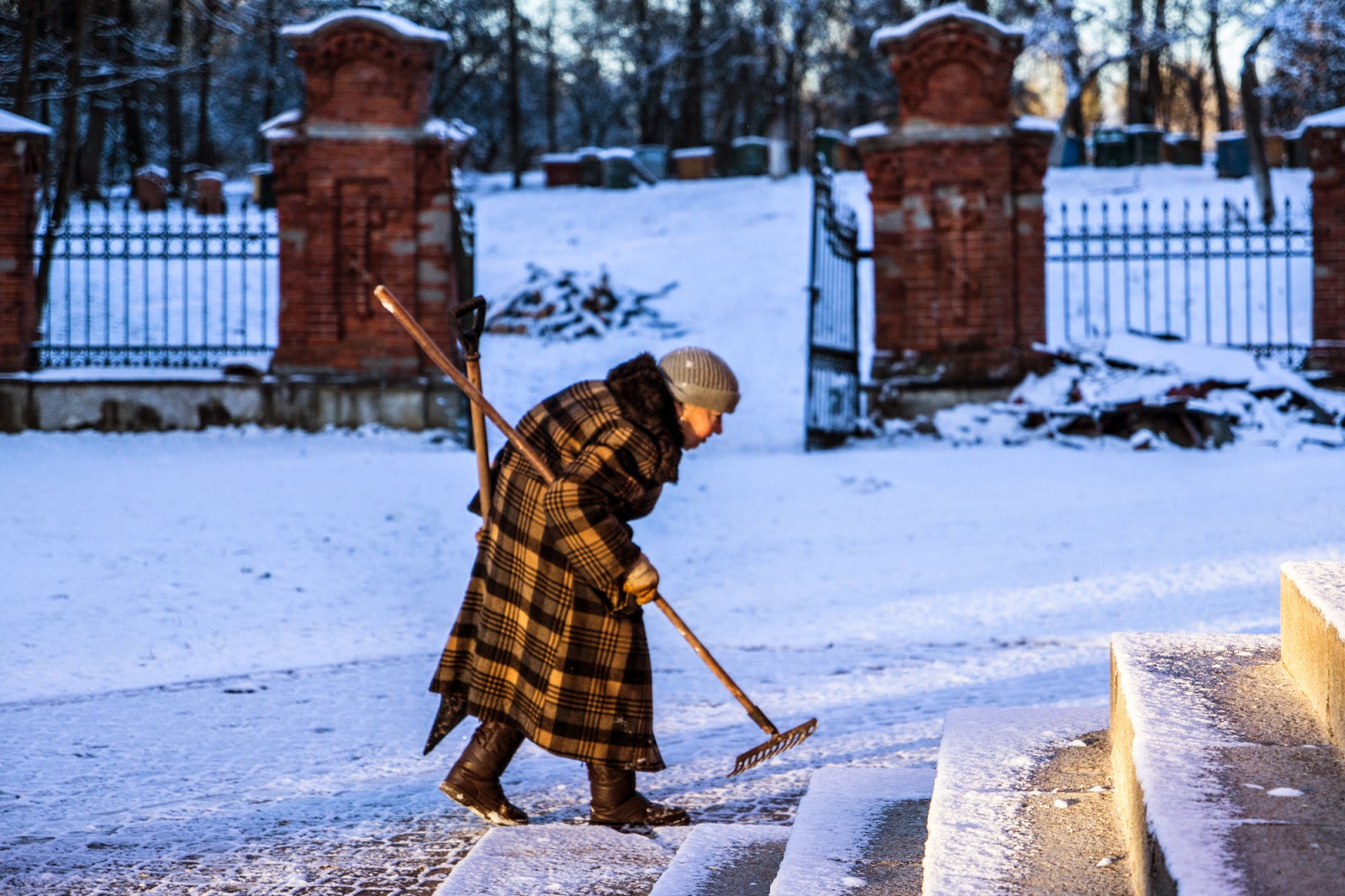Cerkiew prawosławną w Białowieży tego sezonu remontowano. Porządku na jej terenie pilnowała malutka babuleńka, zgięta pod ciężarem lat pracy.