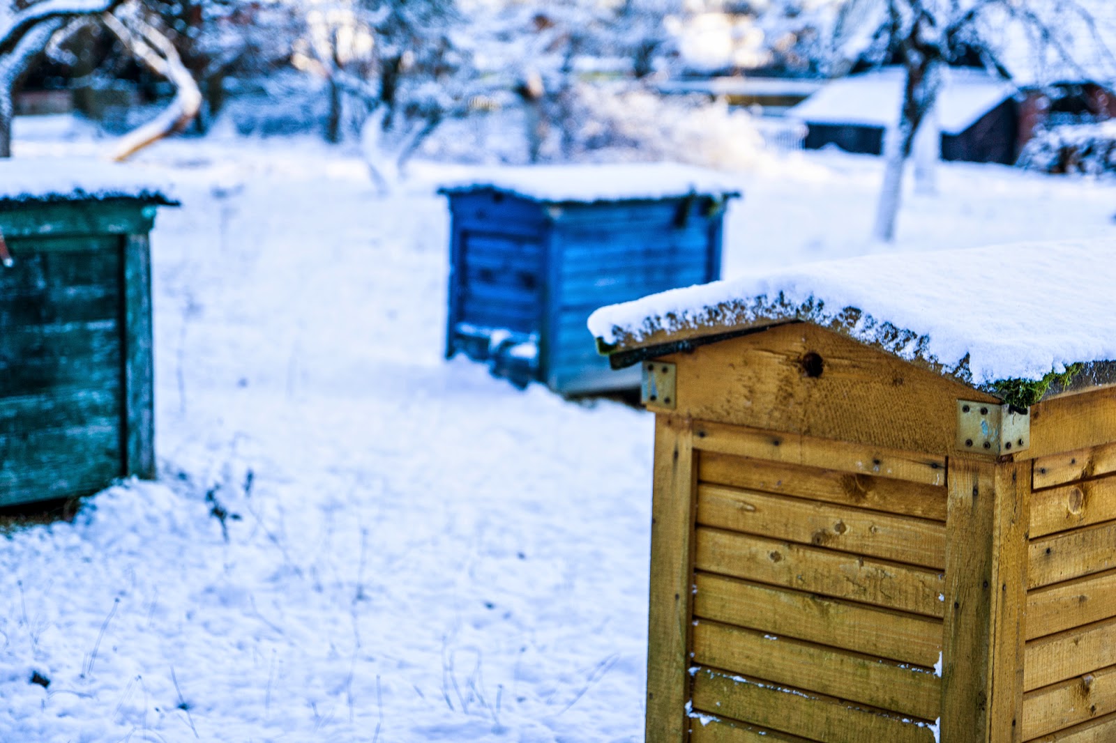 Pasieka za cerkwią, pełna żywych kolorów pod zimową pierzynką.