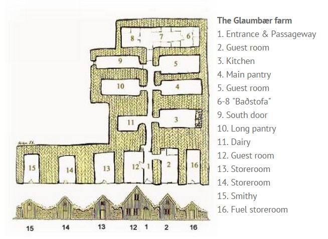 Torfowe domy są zagłębione do połowy w ziemi, dachy przykryte zielenią, wewnątrz klepiska. Takie konstrukcje były powszechnie stosowane na wiejskich terenach Islandii do 1900r. Ich popularność tłumaczy fakt, iż na Islandii praktycznie nie ma drzew, a zatem drewna jako budulca.