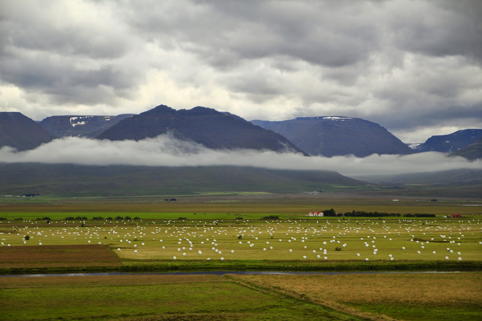 Każda pora roku zmienia krajobraz Islandii. Sierpień, pora tuż po sianokosach, pokrywa wszystkie jej zbliżone do płaskiego tereny patternem z owiniętych białą folią belek siana.