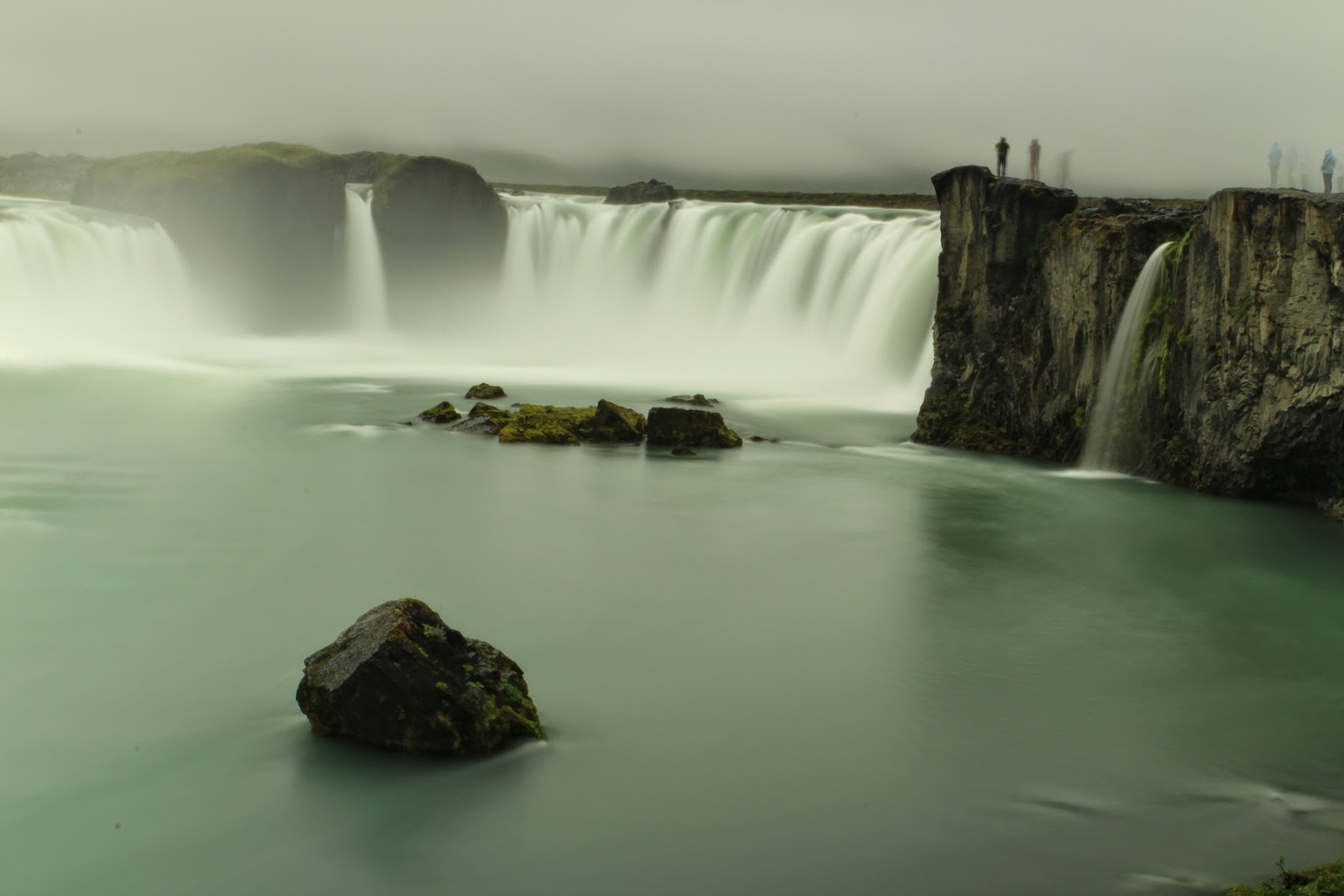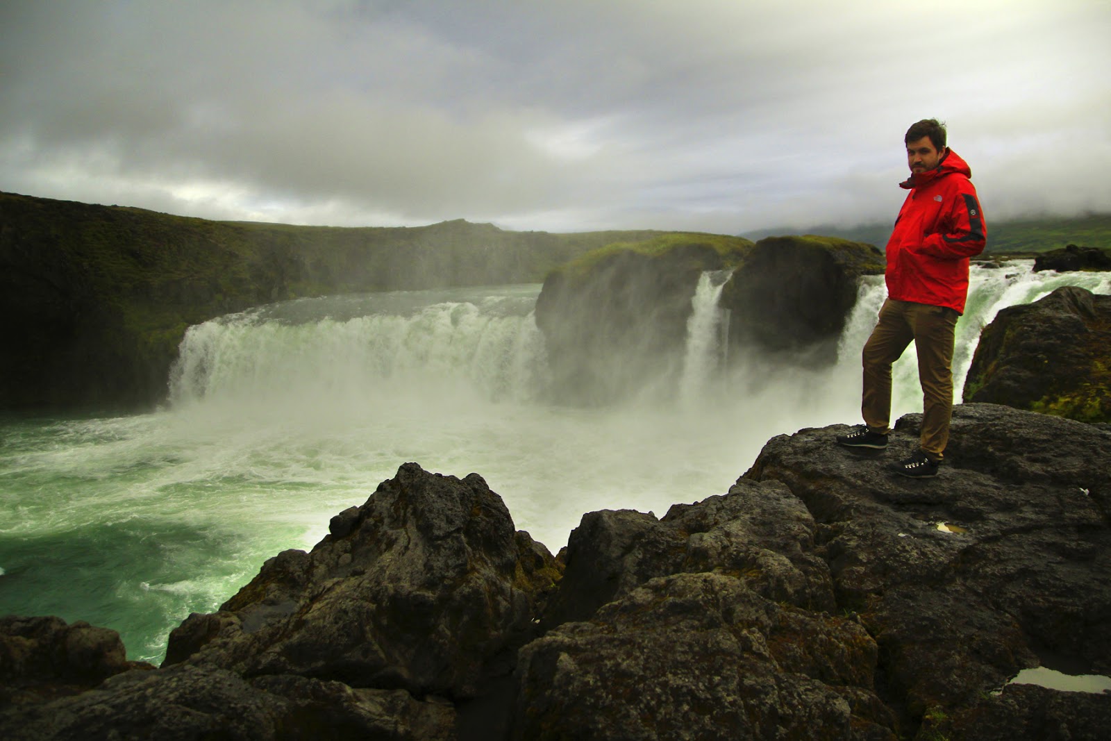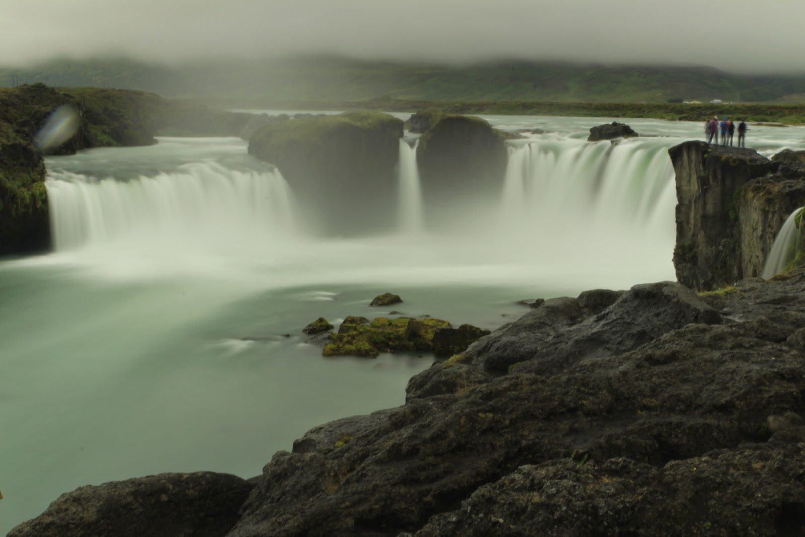 Wodospad bogów – Goðafoss. W chłodny i mokry dzień unosiła się nad nim para wodna, a wiatr chłostał gapiów. Wody jest na tyle dużo i spada z na tyle wysoka, że tworzy nigdy nie ustający huk.